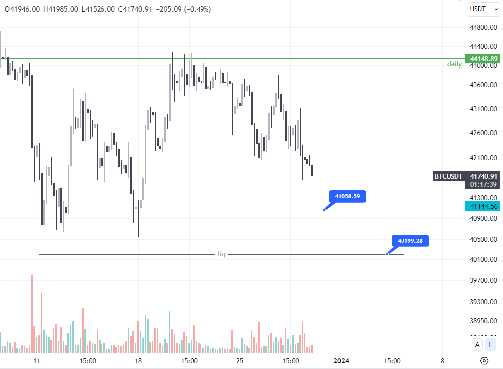 درصورتی که حجم مثبت و خوبی وارد مارکت شد کندل قویی بعد از تاچ شدن قیمت به سمت بالا داشتیم میتونیم در نظر بگیریم که قیمت تا نواحی 42500 میتونه صعود کنه درصورتی که واکنش مثبتی به این ناحیه نداشته باشیم سطح بعدی لیکوییدیتی ناحیه 40500 هست و عدد بعدی 40222 هست